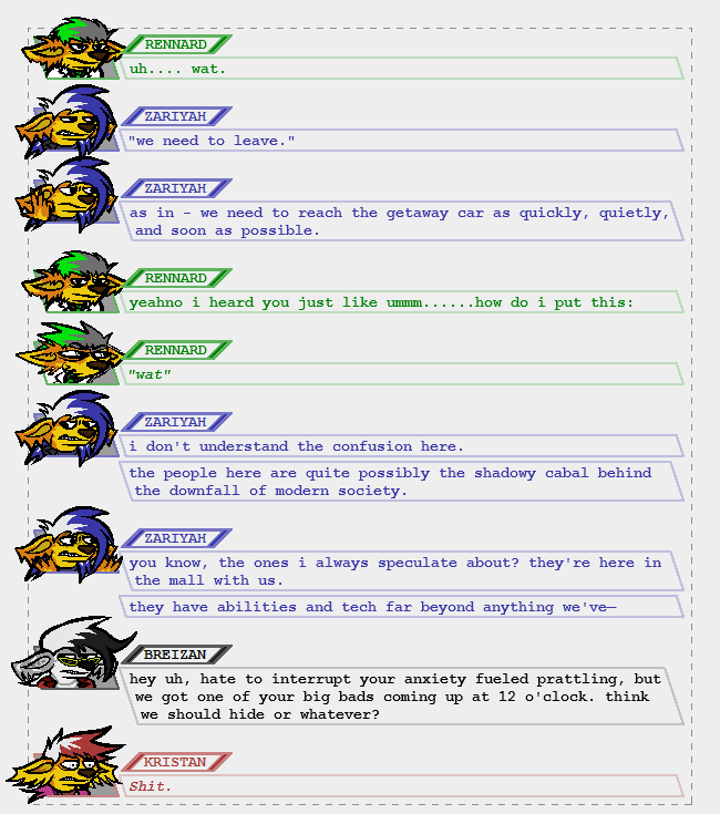 However, the big thing from this is that the original Synodic Reboot has begun the mirroring process. It's somewhat in a similar vein as "earlier dated Zerio work that eventually got cancelled to remake it but better," but the difference is that SR is still my largest work to date at the time of writing, and despite its flaws is still a decently fun read with actual events that occur. And that maybe one day I'll give it a conclusion. Possibly.