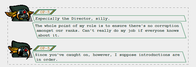 OP-5: Since you've caught on, however, I suppose introductions are in order.