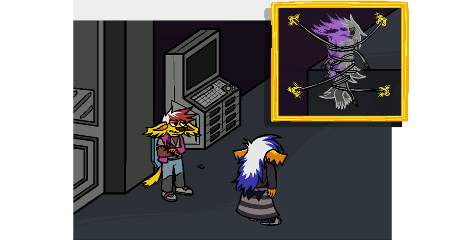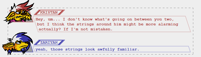KRISTAN: Hey, um... I don't know what's going on between you two, but I think the strings around him might be more alarming actually? If I'm not mistaken.