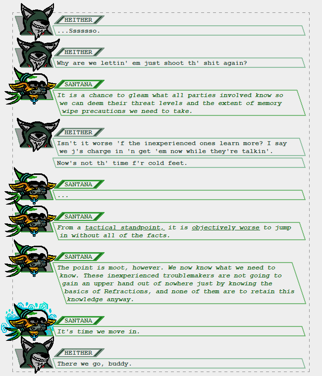 SANTANA: The point is moot, however. We now know what we need to know. These inexperienced troublemakers are not going to gain an upper hand out of nowhere just by knowing the basics of Refractions, and none of them are to retain this knowledge anyway.