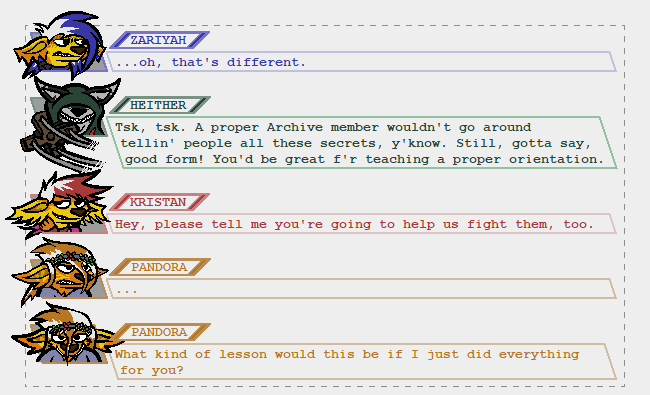 HEITHER: Tsk, tsk. A proper Archive member wouldn't go around tellin' people all these secrets, y'know. Still, gotta say, good form! You'd be great f'r teaching a proper orientation.