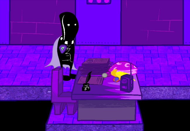 The PURPLE FOLDER you swiped earlier is also nowhere to be seen, as it was placed back in the hands of the EXASPERATED SCRIBE before he went to carry on with his own business. Which, yeah. Fair enough.
